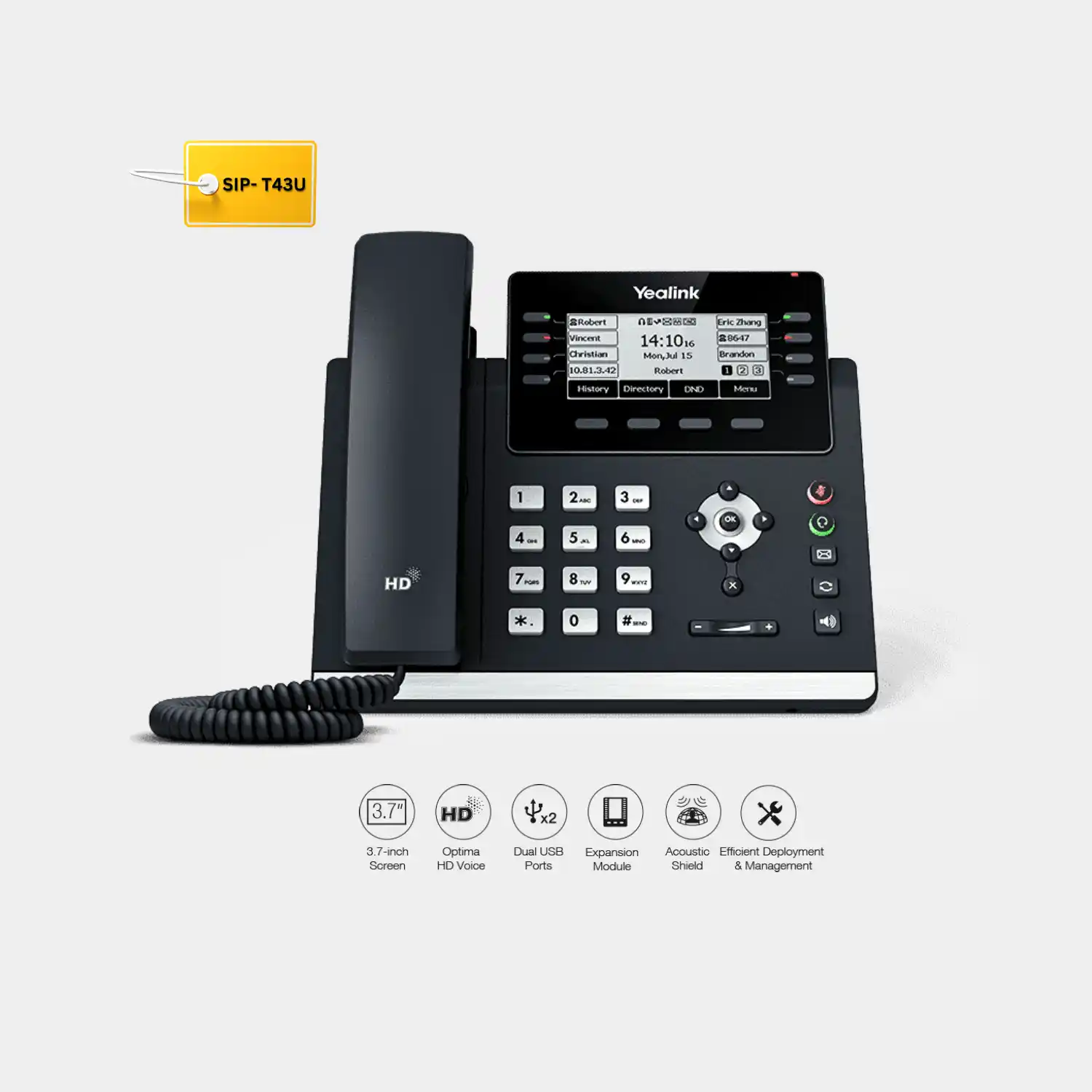 - The T43U supports 12 lines and has a black and white 3.7 inch display. Featuring HD Voice and Opus. the T43U has been designed with great audio in mind so that every call is heard loud and clear on both ends. The dual USB ports on the T43U allow users to connect to Bluetooth, Wi-Fi and/or USB headset and also allows for the ability to do USB recording. Users have the ability to pair a Yealink EXP43 expansion module to add up to 20 physical keys on each page with dual-color LEDs. The Yealink T4U Series have the same elegant design as the previous T4 line, but comes with the benefits of improvements for greater interoperability and better collaboration.
